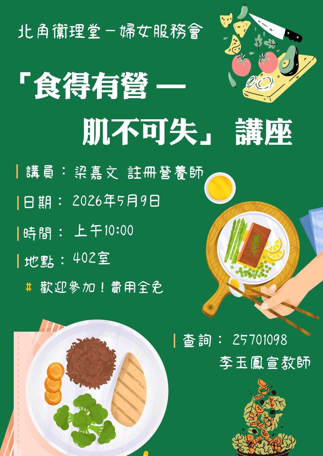 Featured 「食得有營——肌不可失」講座 Fan LukApril 25, 2026 平時大家食嘢有冇注意到營養呢?食物又會怎樣影響我們的肌肉呢? 誠邀梁嘉文註冊營養師為我們講解。 🥑🌽🍝🍦 日期:2026年5月9日 時間:上午十時 地點:北角衛理堂402室 🎉歡迎參加、費用全面 查詢:25701098 李玉鳳宣教師